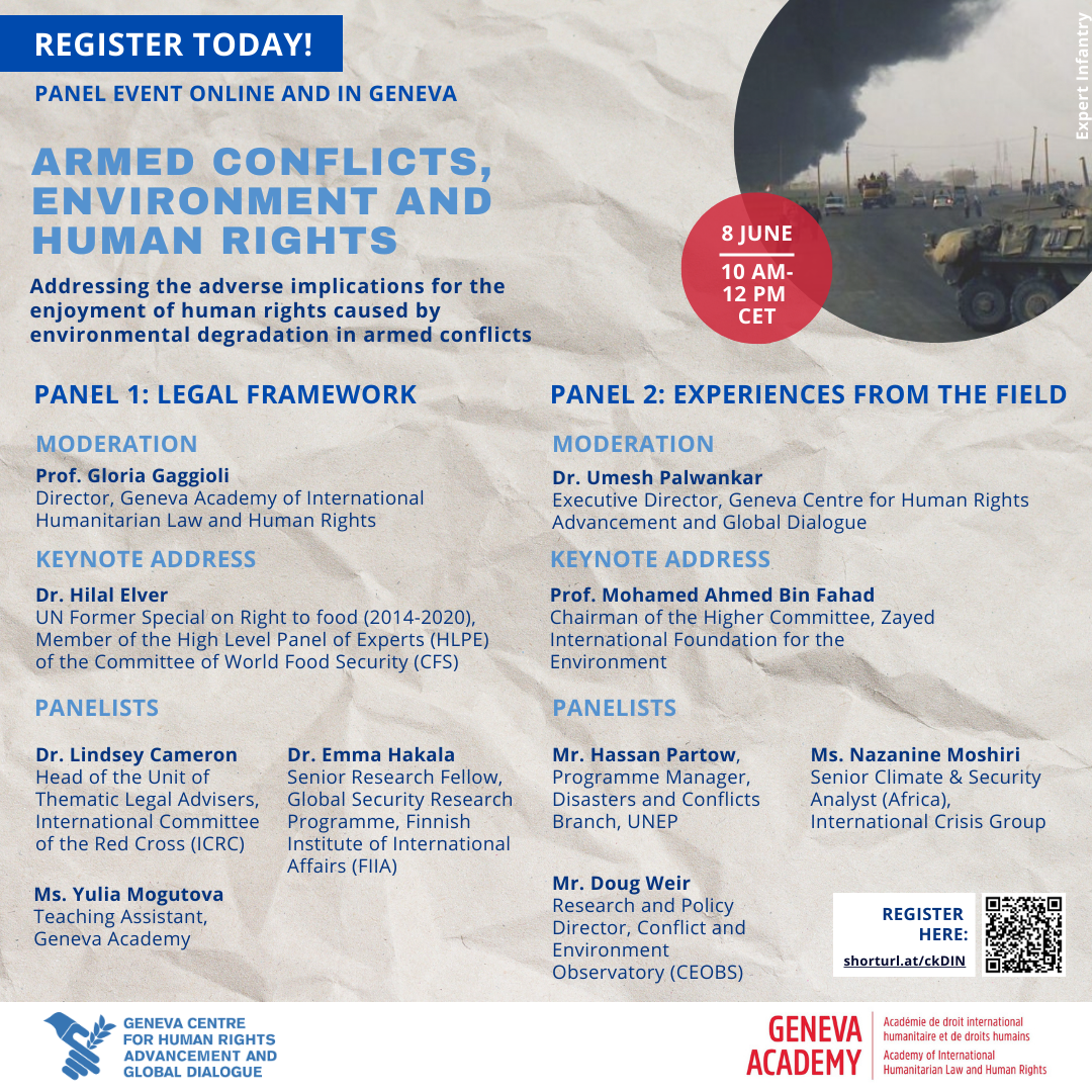 This conference, co-organized with the Geneva Centre for Human Rights Advancement and Global Dialogue, will address the adverse implications for the enjoyment of human rights caused by environmental degradation in armed conflicts.