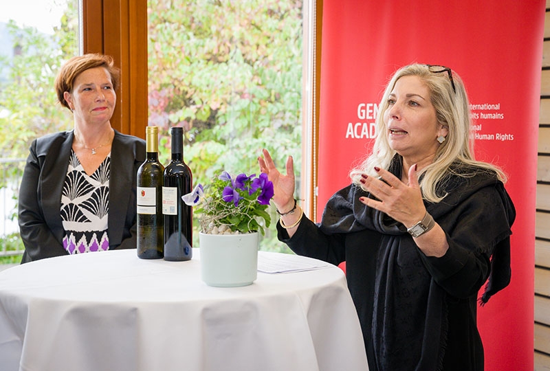 On Thursday, 10 October, Ms Nathalie Fontanet, President of the Conseil d'État, presented the 2023 Millésime of the Vigne des Nations to the Geneva Academy of International Humanitarian Law and Human Rights. This award is attributed each year by the Canton of Geneva to an international organisation or association in recognition of their work contributing to a better world.