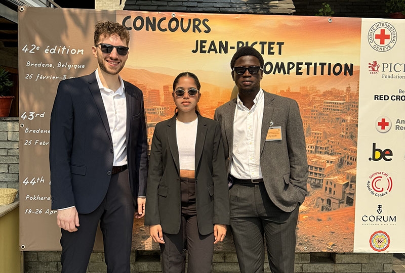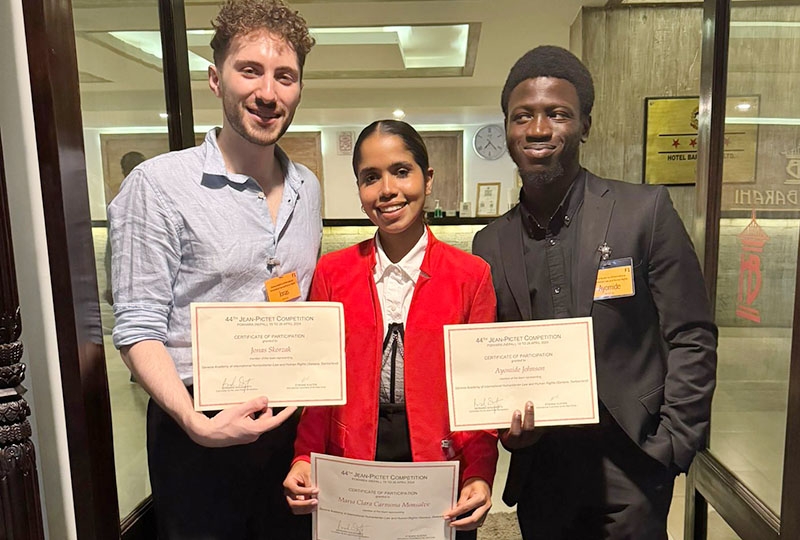 Last year was exceptional, as it was the first time two teams from the Geneva Academy qualified for the event. Eva Patricia Contreras, Yasmeen M'sadek and Hélène Perot formed our first-ever Francophone team and participated in the competition in Bredene, Belgium. The Anglophone edition took place in Pokhara, Nepal where Maria Clara Carmona Monsalve, Ayomide Johnson and Jonas Skorzak represented the Geneva Academy. The teams were coached by our Research Fellow Dr Eugénie Duss and Teaching Assistant Mina Radončić respectively.
